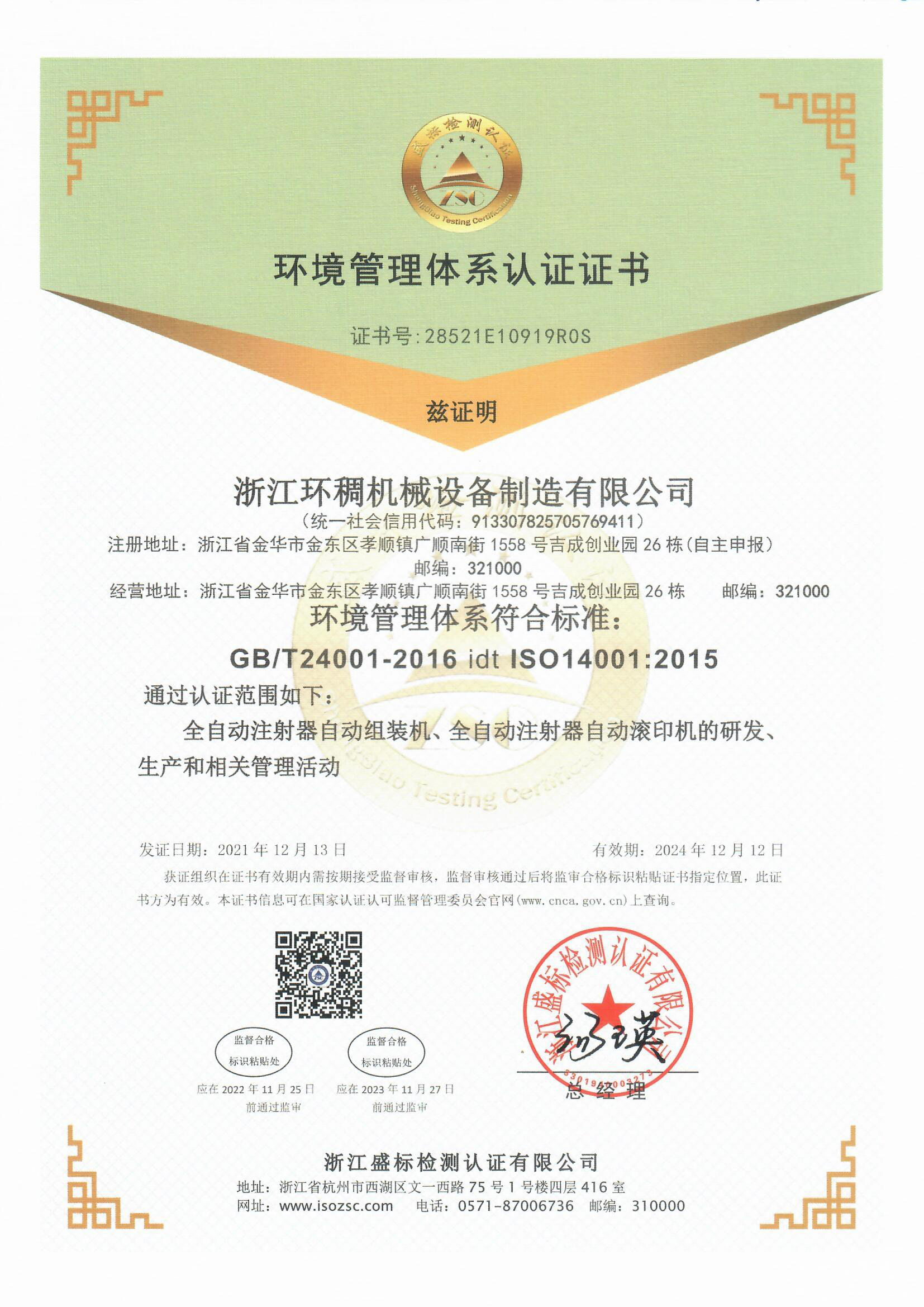 環(huán)境管理體系認證證書