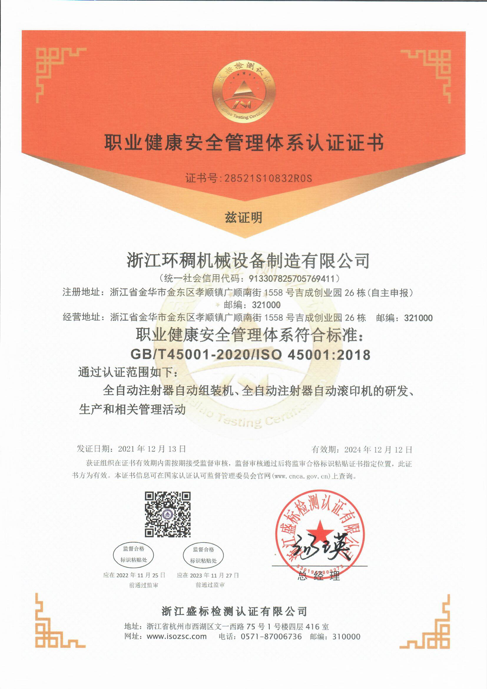 職業(yè)健康安全管理體系認證證書